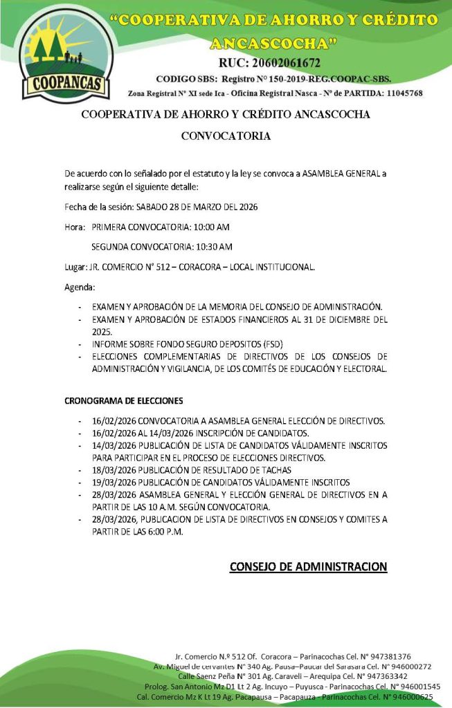 El Consejo de Administración de la Cooperativa de Ahorro y Crédito Ancascocha convoca a todos sus socios a participar en la Asamblea General, conforme a lo establecido en el Estatuto y la normativa vigente.